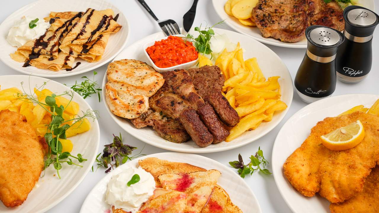 3x ćevap, 1x vratina, 1x piletina, 1x pljeskavica, pomfrit, ajvar, luk