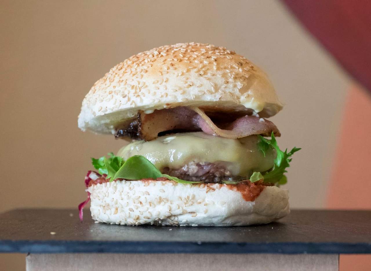Hamburger di bufala 200g, pomodoro, cipolla, rucola, melanzane grigliate e salse
