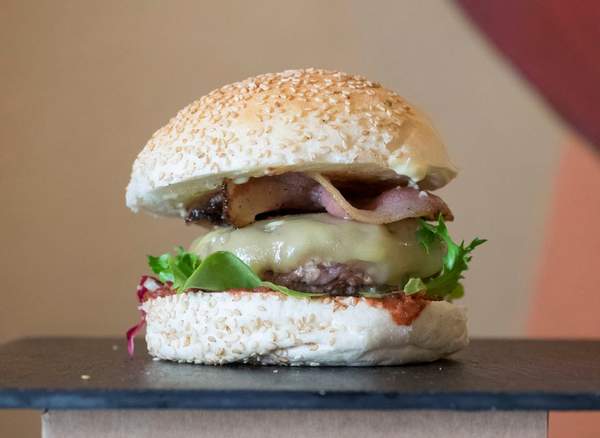 Carne di Wagyu 220g, rucola, uovo, pomodori secchi, peperoni, melanzane, cipolla, formaggio, salsa barbecue e salsa cheddar
