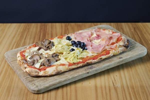 Pomodoro, mozzarella, funghi champignon, prosciutto cotto, olive nere e carciofi