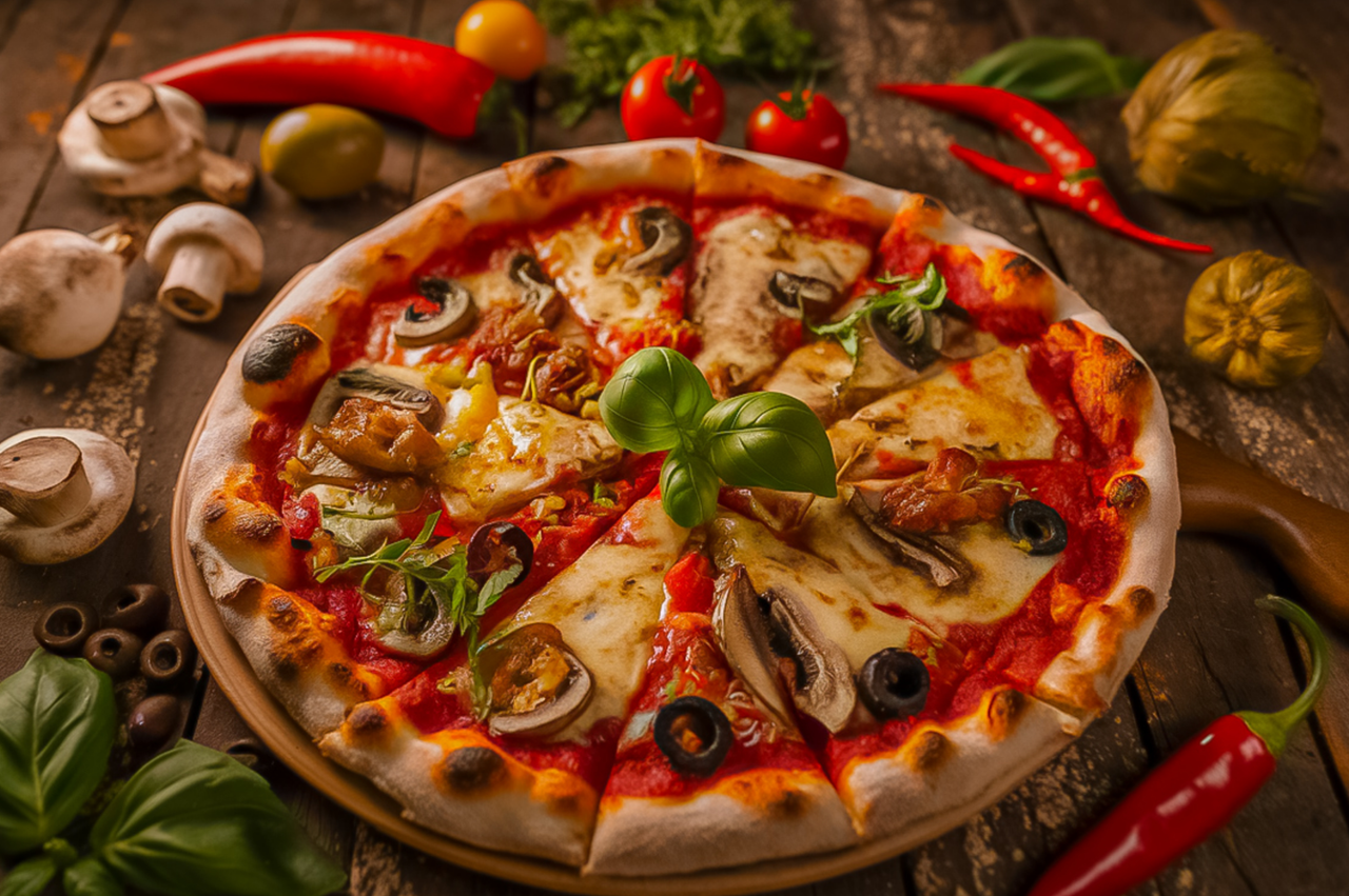 Pomodoro, mozzarella, prosciutto cotto, funghi, carciofi, würstel, cipolle