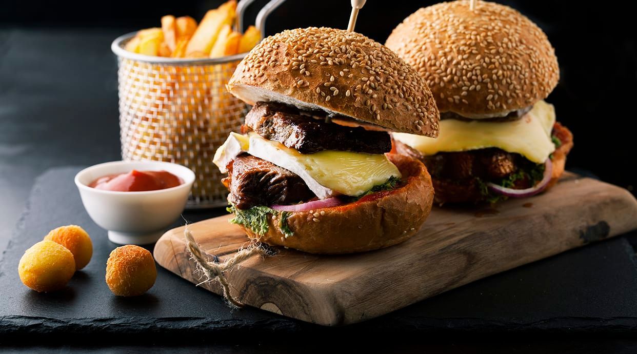 Doppio Hamburger di scottona 200 g, pomodoro, pancetta arrostita, cipolla fresca, salsa cheddar piccante, sottiletta, insalata riccia