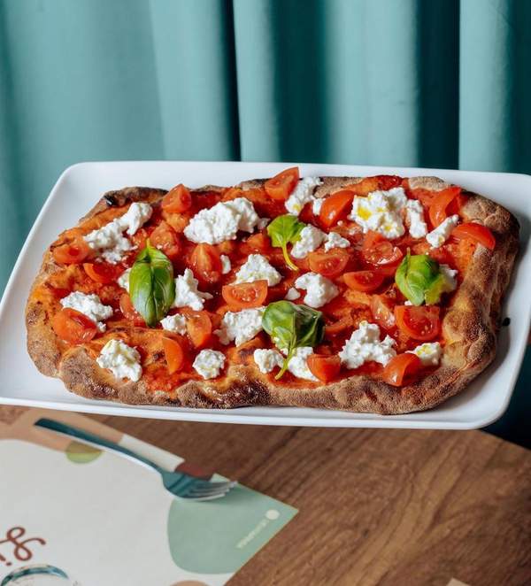 Prosciutto crudo, bufala, olio EVO, cipolle caramellate, dressing al basilico