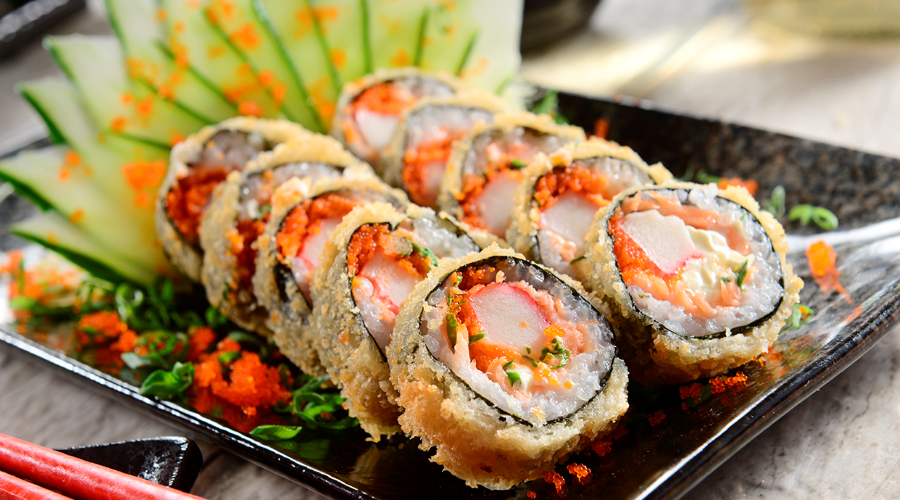 Roll di riso farciti con alga nori, gambero in tempura, avocado, philadelphia, guarniti con salmone scottato, mandorle, salsa plum e salsa teriyaki