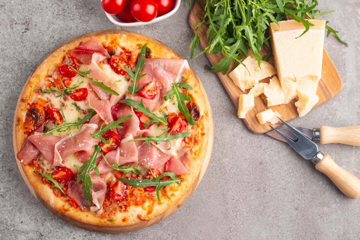 Bufala DOP, pomodorini, rucola, crudo, olio