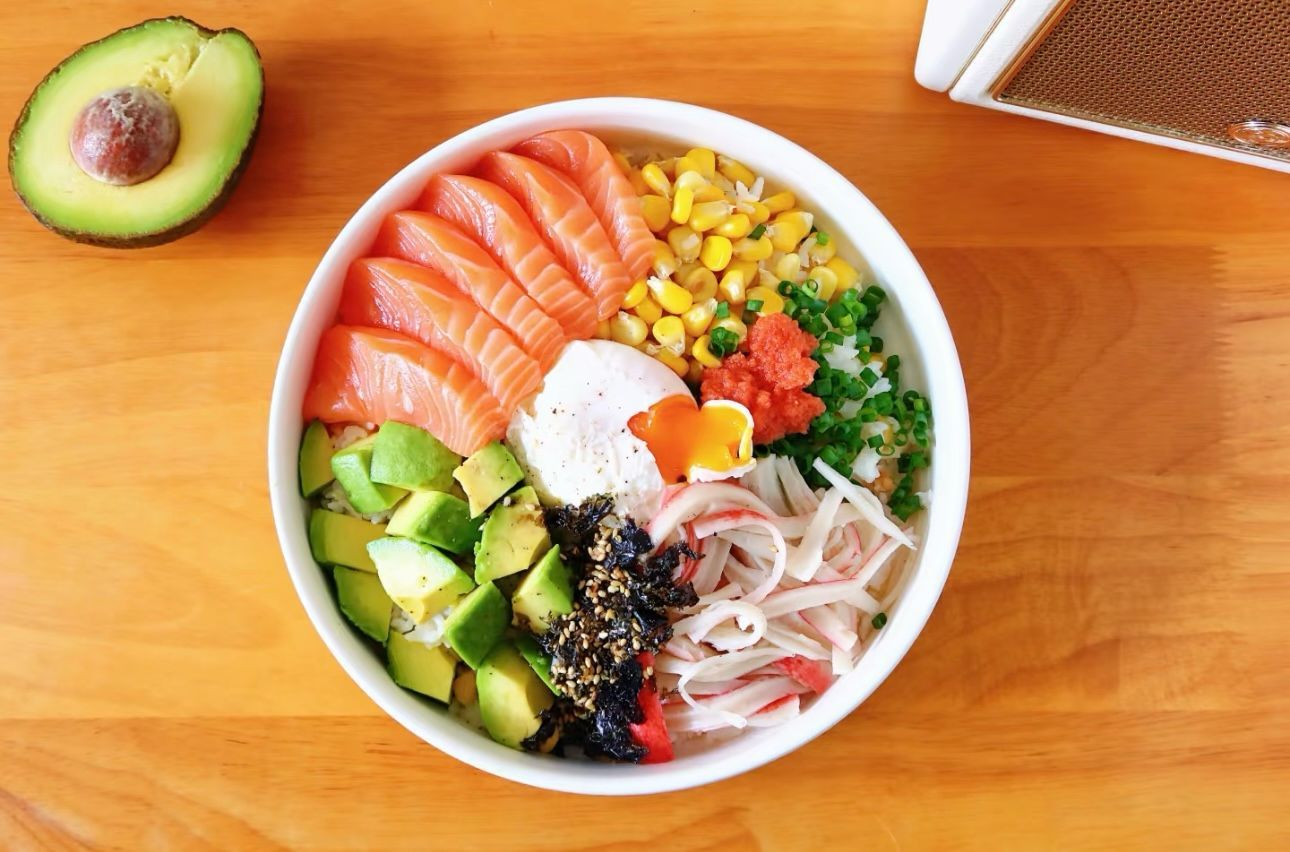 Riso bianco, salmone, edamame, avocado, sesamo, cipolla croccante e salsa teriyaki
