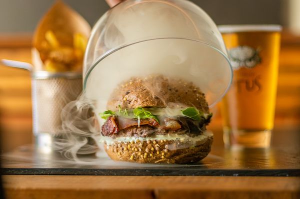 Pane rex corn, hamburger di chianina affumicata con metodo naturale, guanciale croccante, misticanza e stracciatella pugliese profumata al basilico. Servito nella nostra campana di vetro e affumicato con legni naturali pregiati. Servito con patatine
