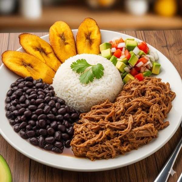 Riso bianco, fagioli neri, carne sfilacciata, platano fritto, insalata mista.