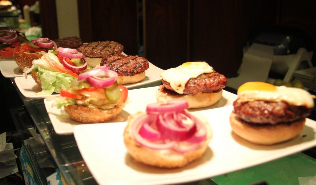 Hamburger di manzo preparato in casa con insalata , pomodoro, cetrioli sott’aceto e cipolle