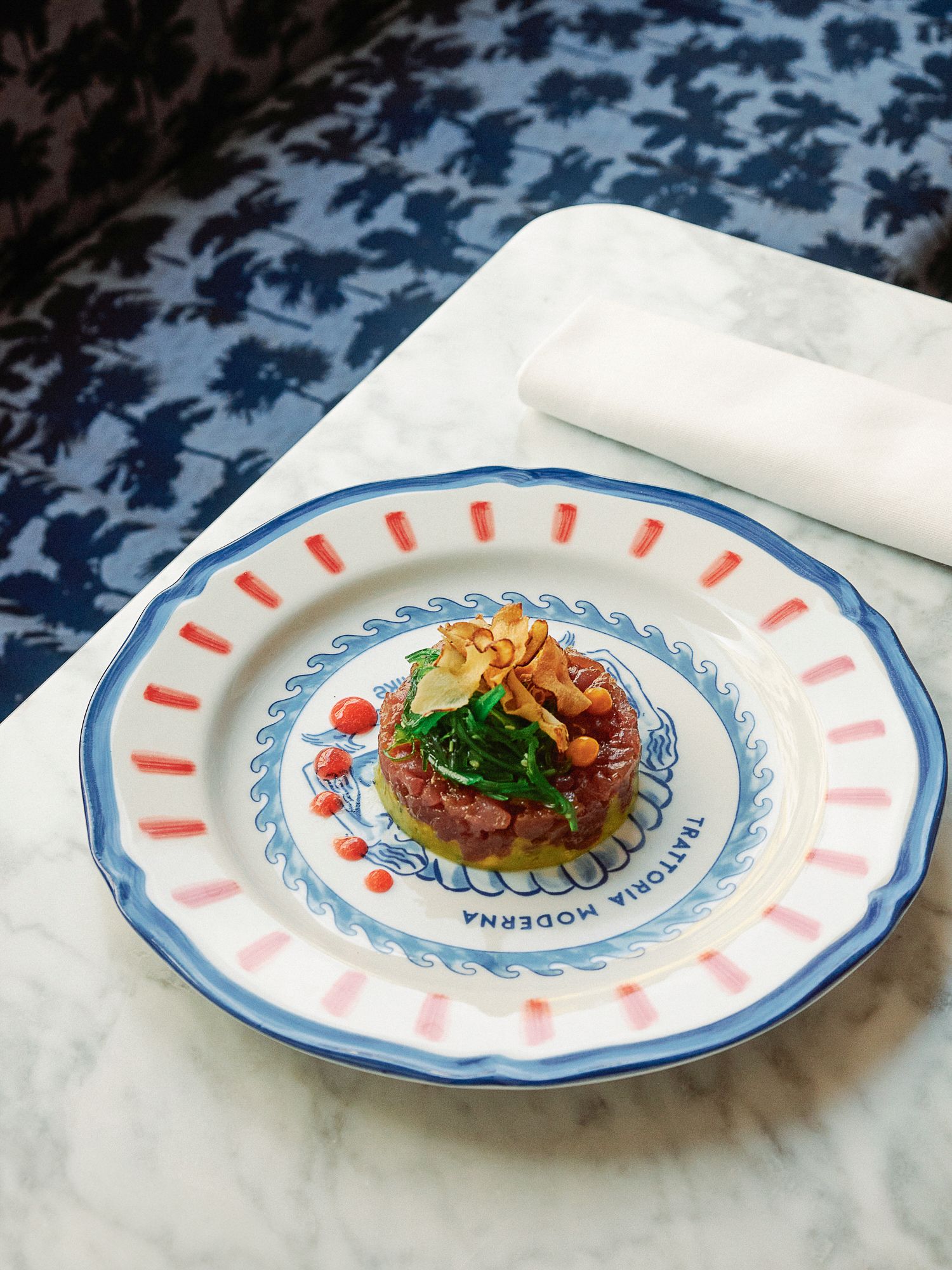 Tartare di filetto di manzo adagiato su midolla di vacca vecchia, con cipolla di tropea e lamponi caramellati, caprino, limone e meggiorana