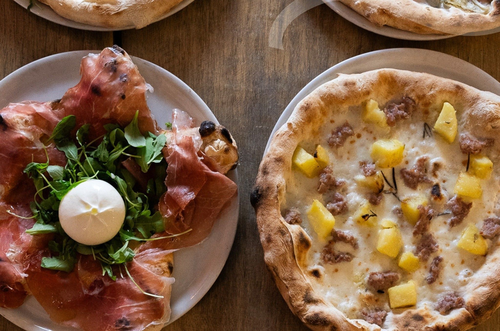 Mozzarella fior di latte, pomodoro, prosciutto crudo di parma, rucola e burrata pugliese