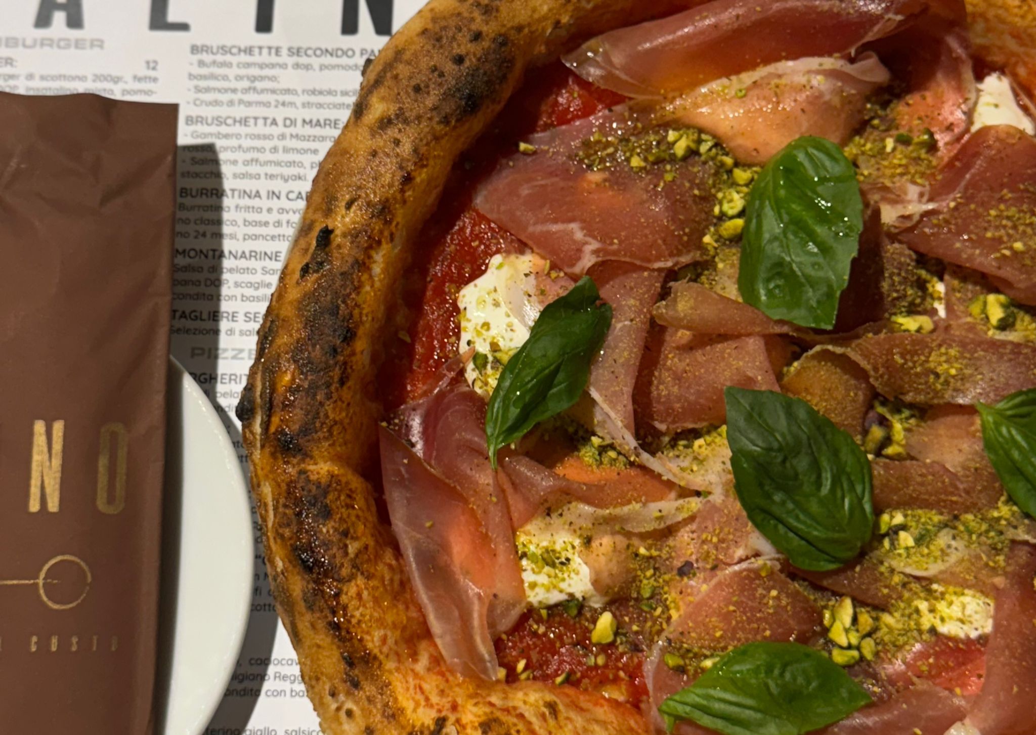 Salsa di pelato San Marzano, in uscita: prosciutto crudo di Parma 24 mesi, stracciatella siciliana, polvere di pistacchio, condita con basilico fresco e olio evo.