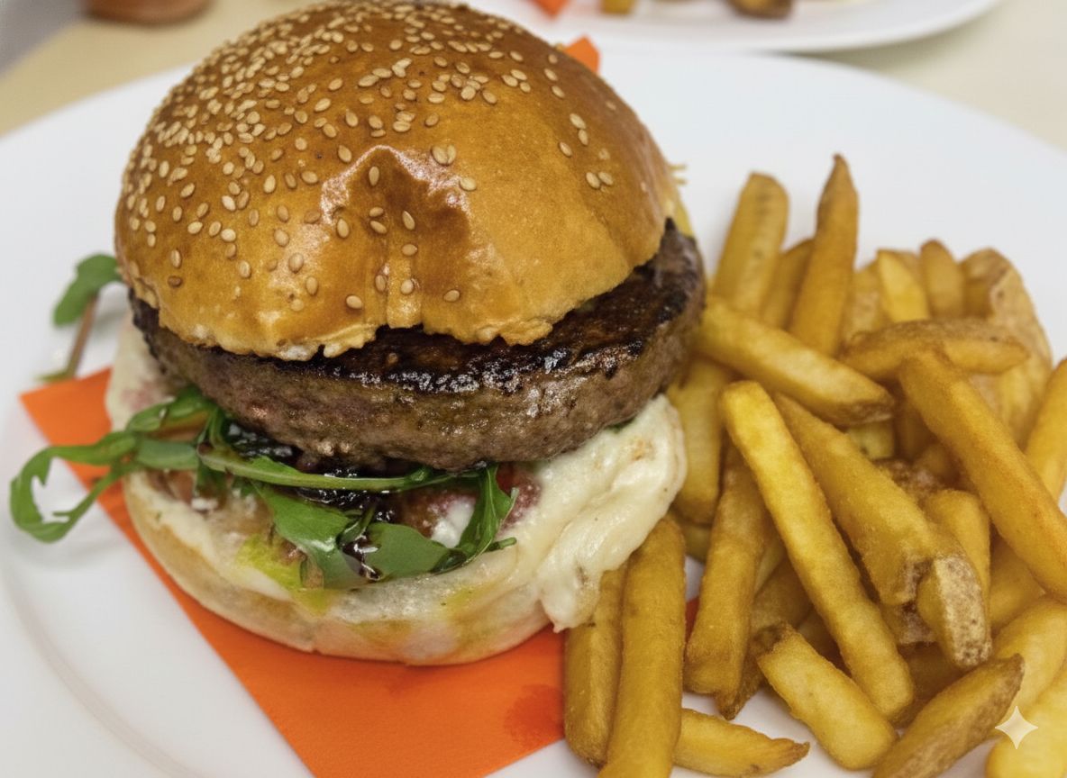 Hamburger, pomodorini di pachino, lattuga iceberg, radicchio, scaglie di parmigiano reggiano DOP