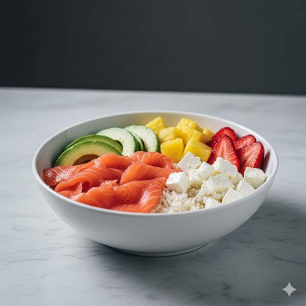 Riso basmati, sfoglie di salmone selvaggio affumicato, edamame, carote julienne, germogli, succo di lime, olio EVO.