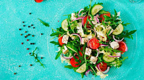 Lattuga, rucola, salmone, feta, avocado, noci, olive, limone, olio, sale.