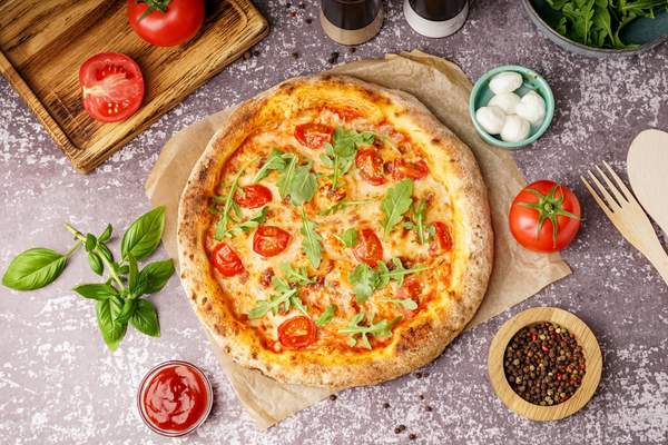 Fiordilatte, prosciutto crudo di Parma, rucola, pomodorini e scaglie di grana