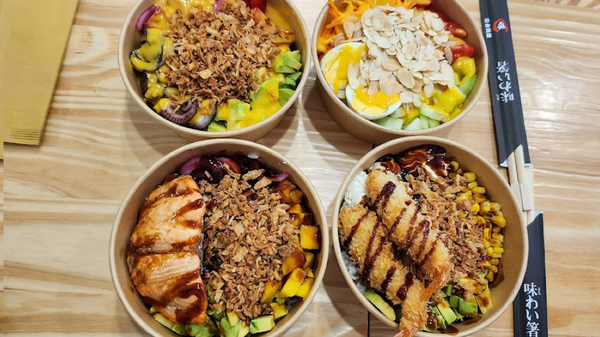 Riso sushi + Salmone + Tonno + Avocado + Zenzero marinato + Edamame + Mango + Teriyaki + Salsa di soia + Cipolla croccante