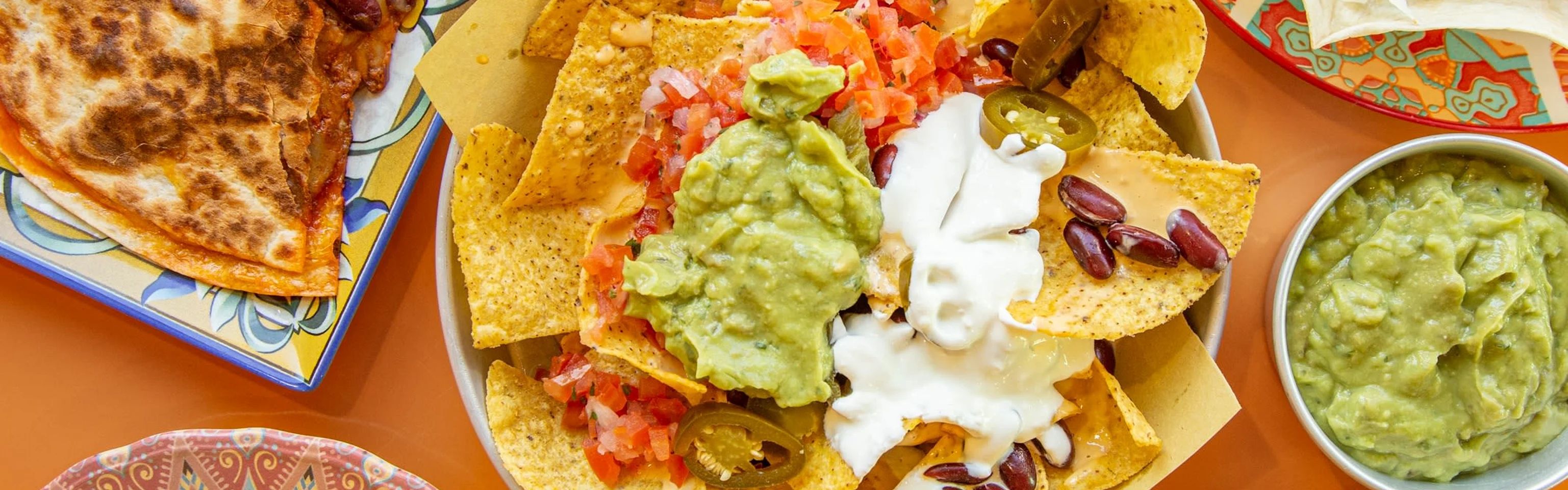 Cheddar fuso, guacamole, panna acida, pico de gallo, jalapenos e fagioli