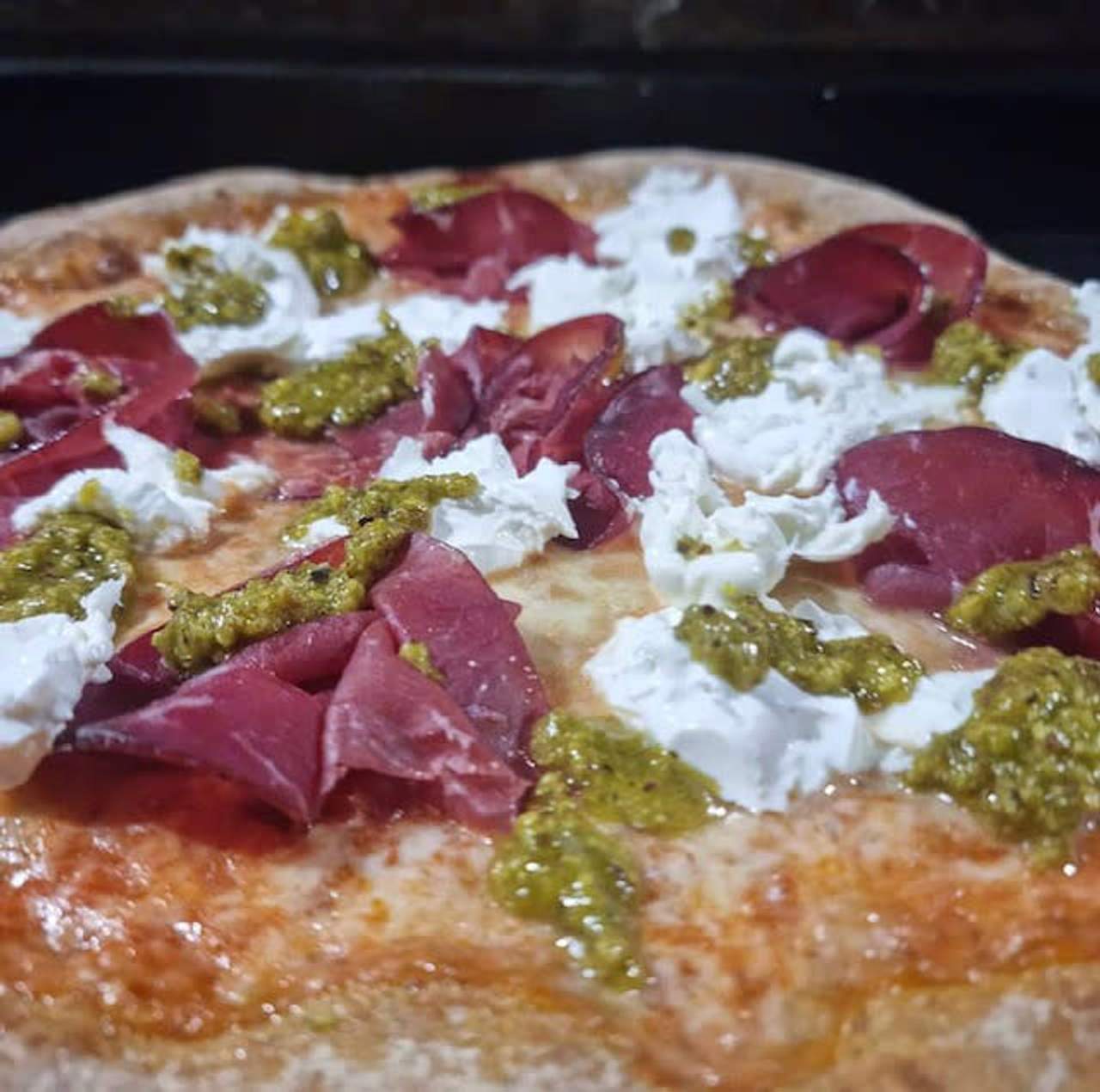 Pomodoro, mozzarella, impasto ai cereali, burrata, mortadella, pesto