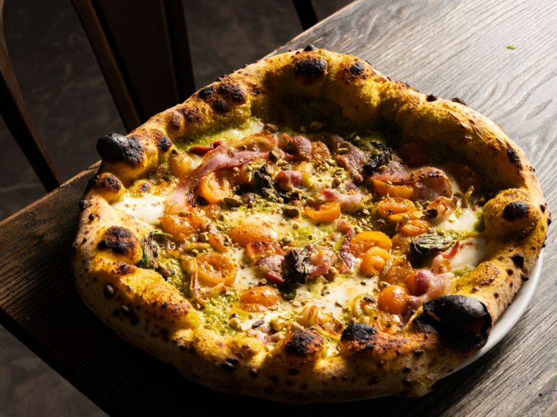 Crema di pistacchio, provola, pomodoro datterino giallo, pancetta croccante, granella di pistacchio, olio EVO, parmigiano