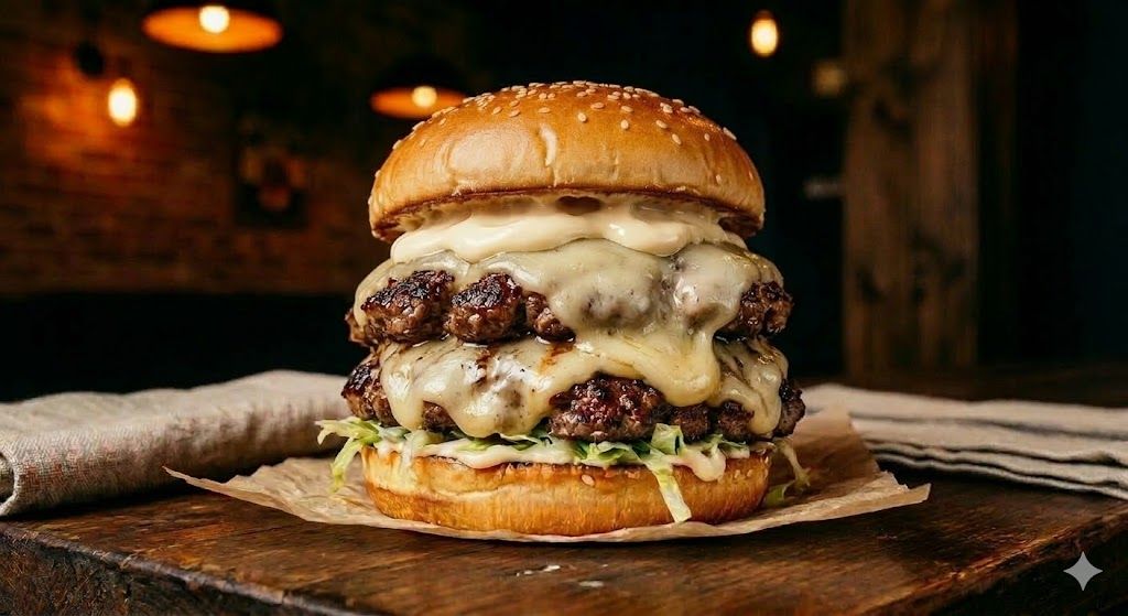 Pollo fritto croccante, bacon, salsa rosa, insalata. Due smash compresa patata fritta. Allergeni: glutine, uova, senape