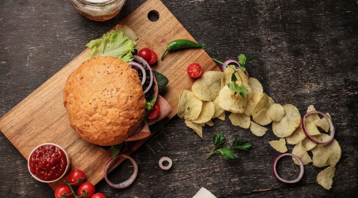 A Classic Burger Featuring A Juicy Beef Patty Topped With Melted Cheese, Lettuce, Tomato, Onions, Pickles, And Served On A Toasted Bun.