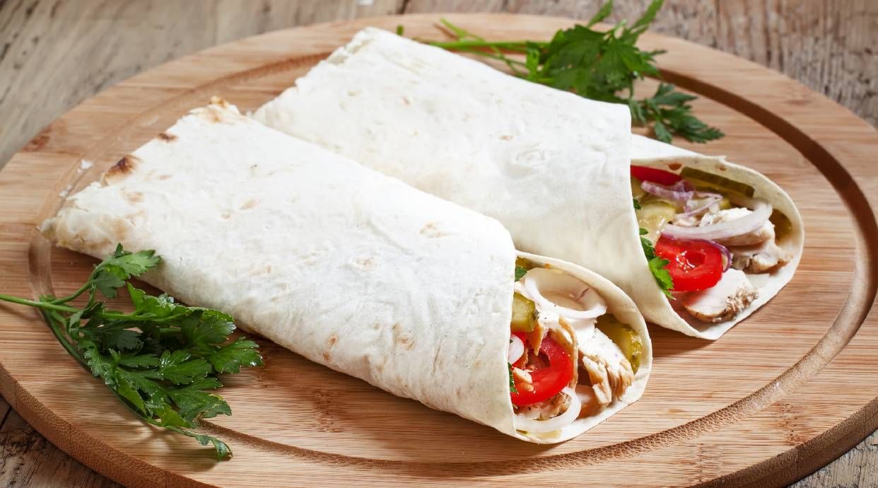 Лепешка, кусочки курицы, помидоры, огурцы, фирменный соус, томатный соус