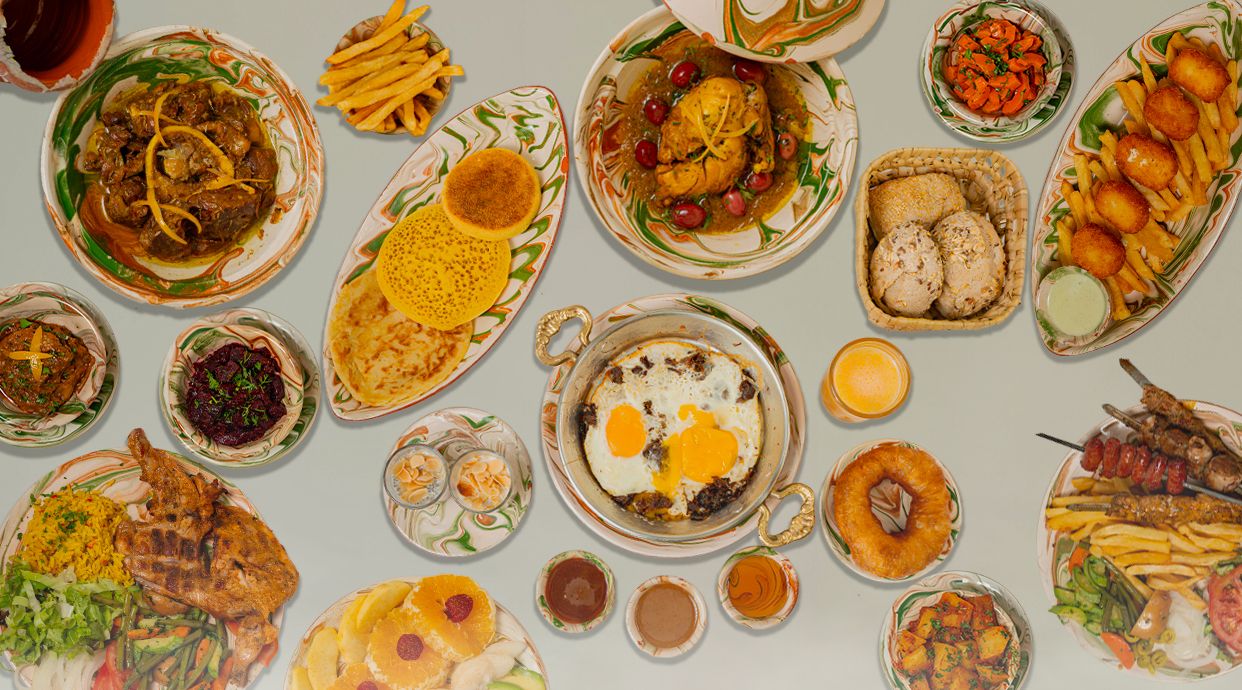 Cassolette œuf khlii, galette marocaine miel-beurre caramel, amlou huile d'olive, 2 mini verrines, jus d'orange ou carotte au choix, pain maison,chfenj
