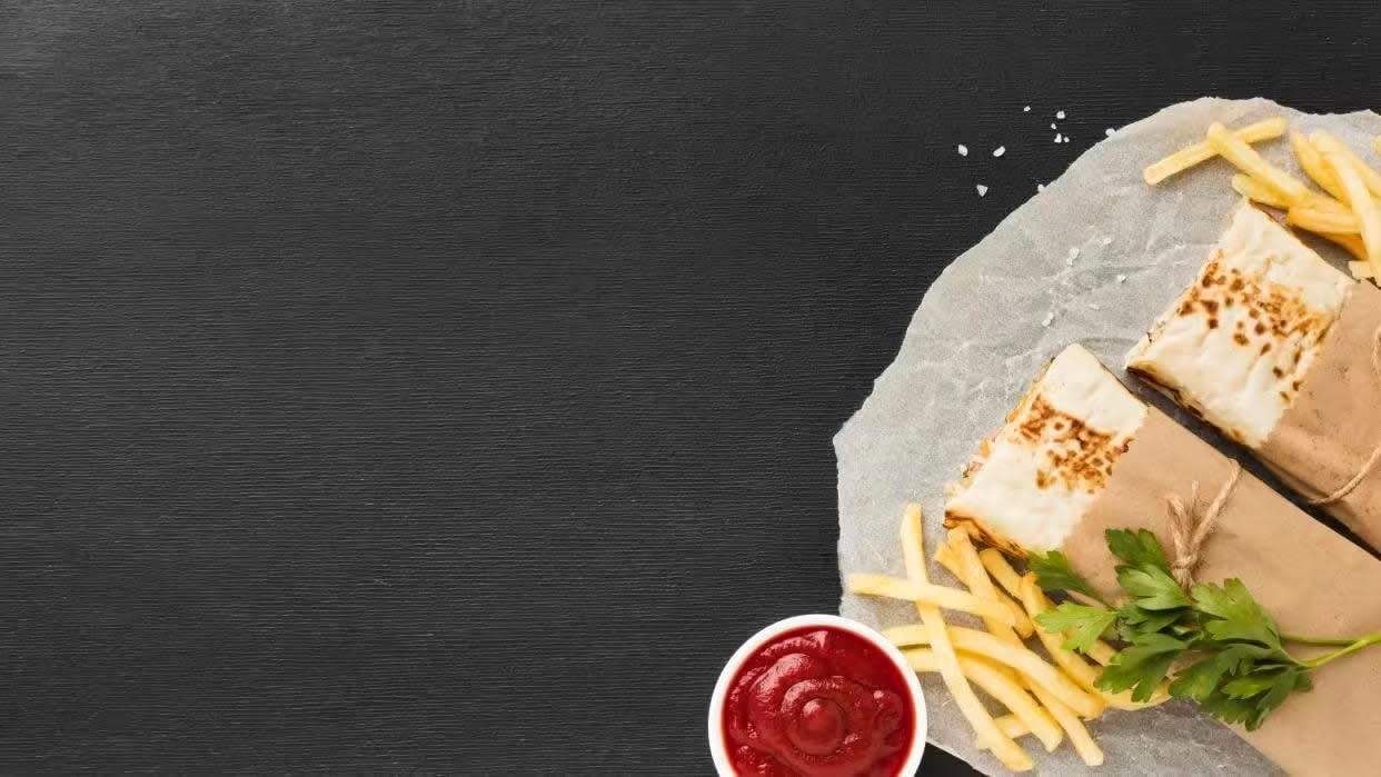 Shawarma, sauce, salade variées, tomates, pain libanais, frite .