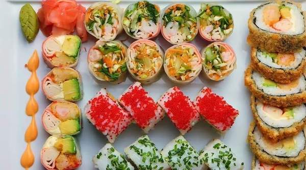 Idéale pour 6/7 personnes - Californias (40 Pièces), Makis (24 Pièces), Sushis Frits (24 Pièces), Aromakis (12 Pièces), Spring Rolls (16 Pièces), Nigiris (4 Pièces)