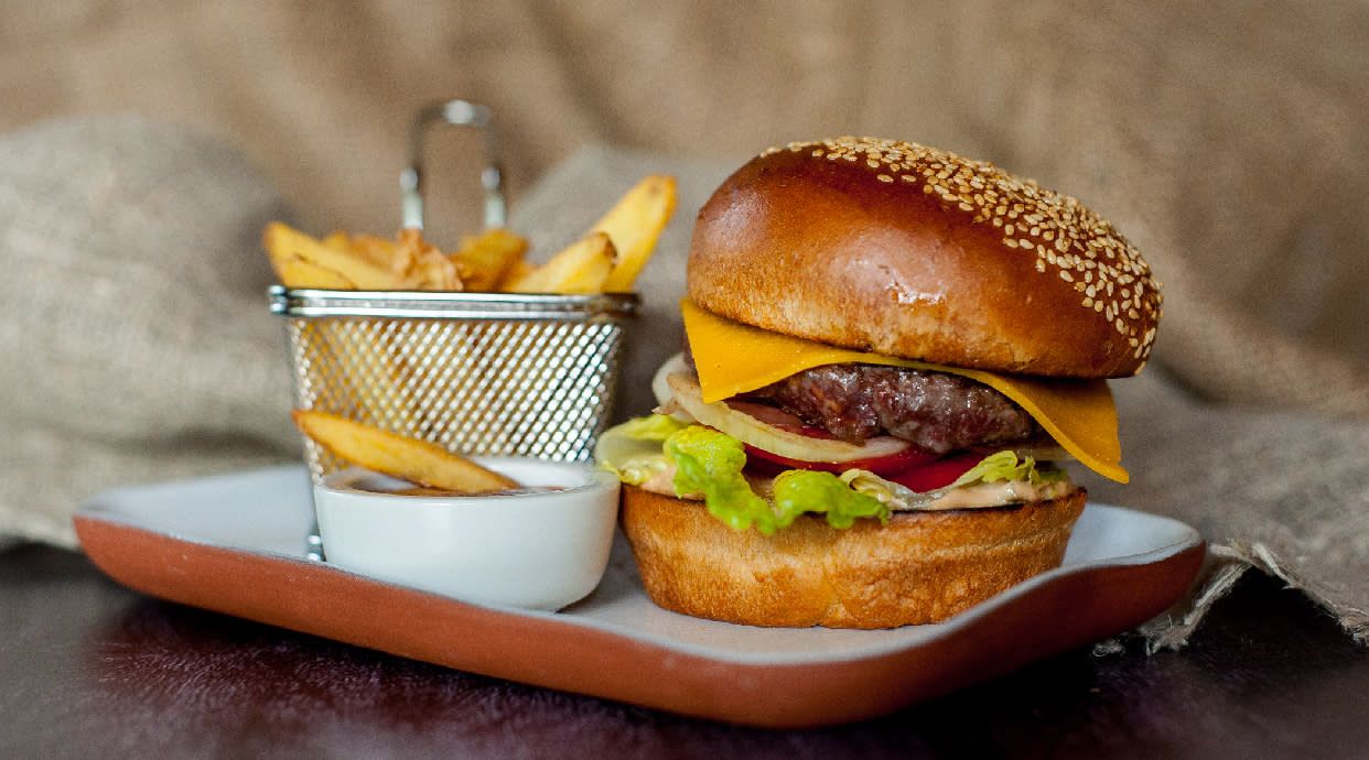 Beef burger, cheddar cheese, burger sauce, lettuce, red onion and pickles