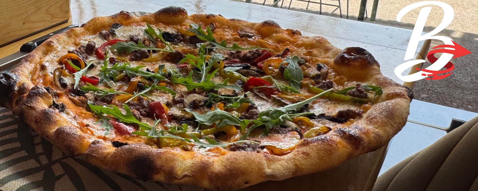 Pain pizza, bœuf haché, pepperoni, cheddar, oignons caramélisées, Roquette, sauce burger maison.