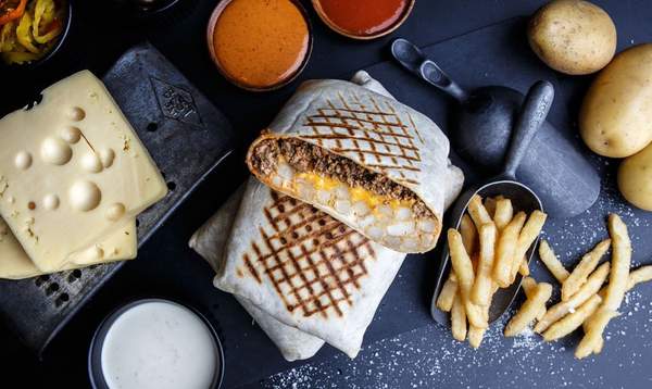 Galette garnie de morceaux de poulet, légumes et sauce au choix