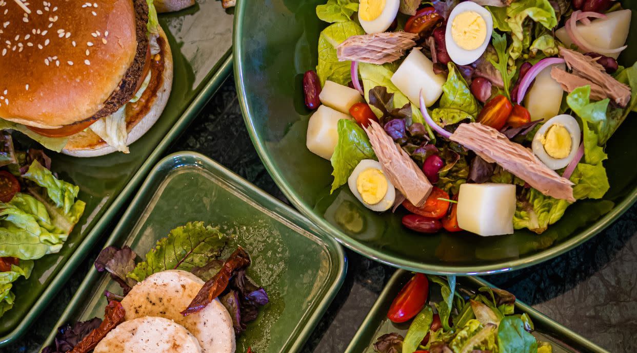 Salade romaine, tomates cerises, pommes de terre, haricots rouges, thon, oignons confits et œufs de cailles