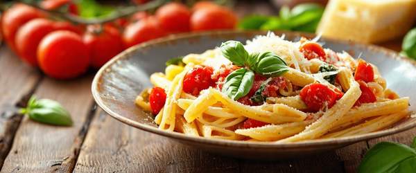 Penne (pâtes) tomatespiments rouges (pour le piquant caractéristique) ail