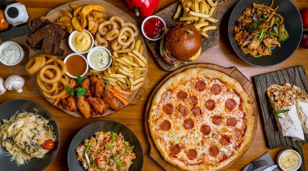 Breaded chicken, turkey ham, vegetables, cheese and fries