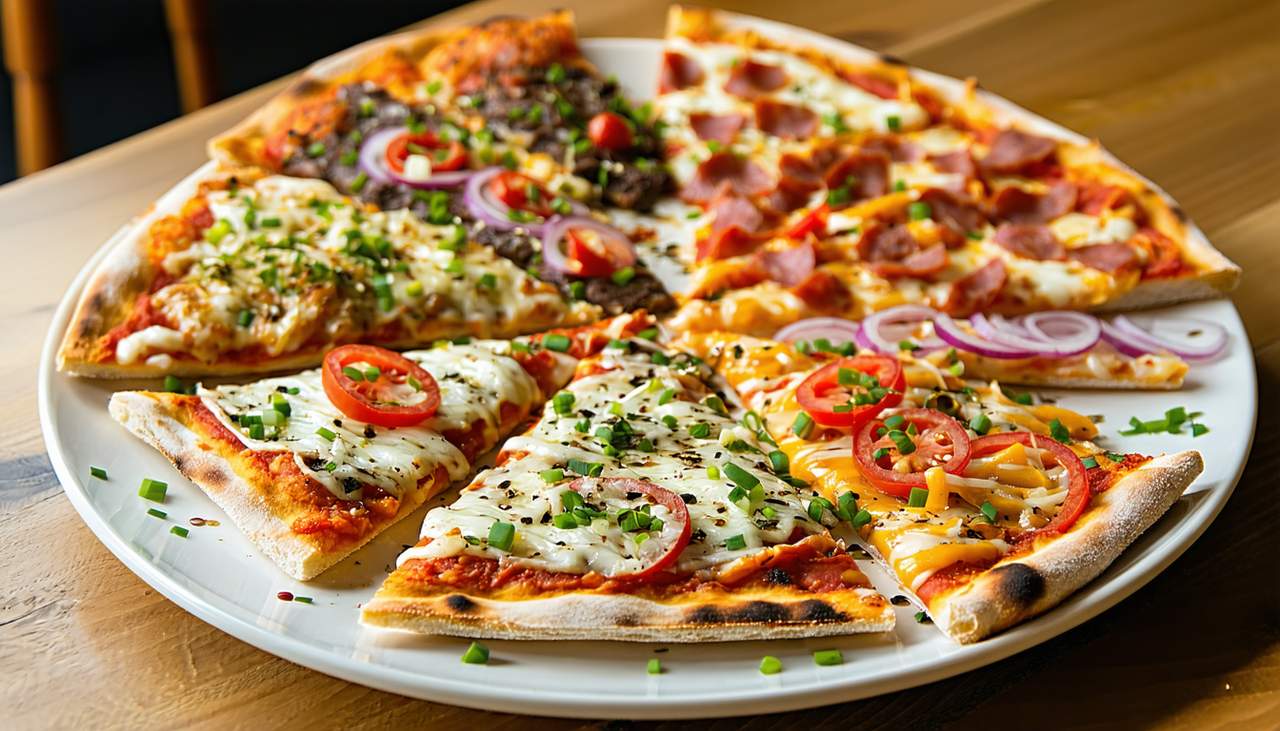 Pâte fine, sauce tomate, mozzarella, fruits de mer, poulet, viande hachée, olives - une saveur par quart