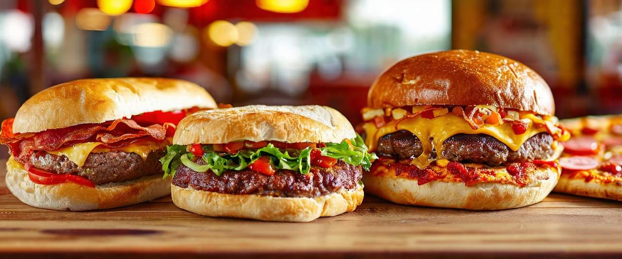 Double viande hachée, double fromage cheddar, oignon caramélisé, champignons, salade, tomate