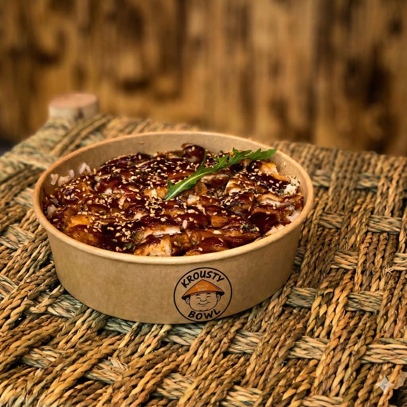 Riz Thaïlandais sautées au wok avec Poulet, oignions assaisonné par une sauce Maison signée Krousty Bowl, Carottes fraiches, Concombres frais, sésame