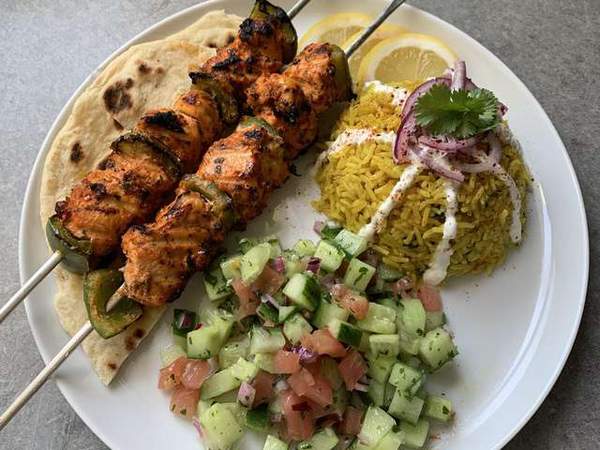 Chich kebab, brochettes poulet, brochettes agneau, riz Basmati