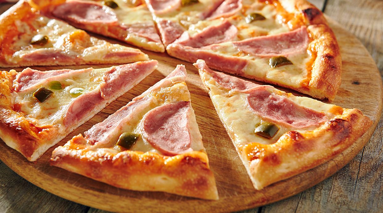 Sauce tomate, mozzarella, poulet, viande hachée, jambon fumé, thon, champignons, olives, olives noires