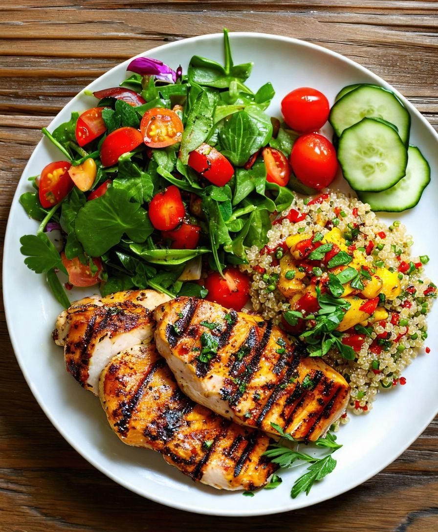 Quinoa, poulet, brocoli, potiron, tomates cerises, oignons, graines de chia, sésame