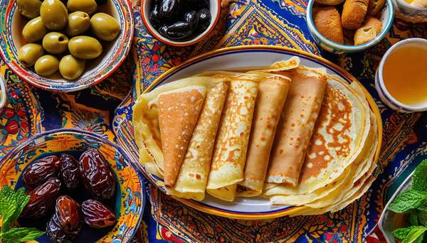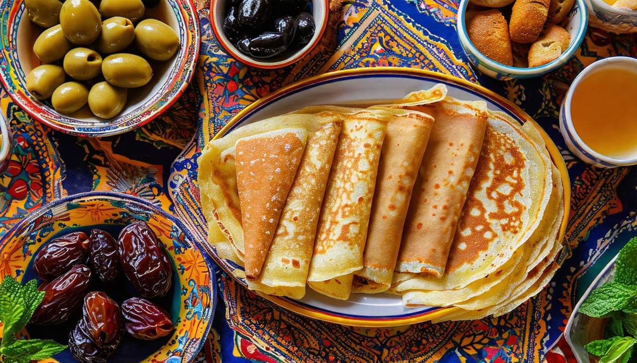 Boisson chaude, jus d'orange frais pressé, M'semen, harcha, beghrir, corbeille de pain, jben, huile d'olive, miel, confiture