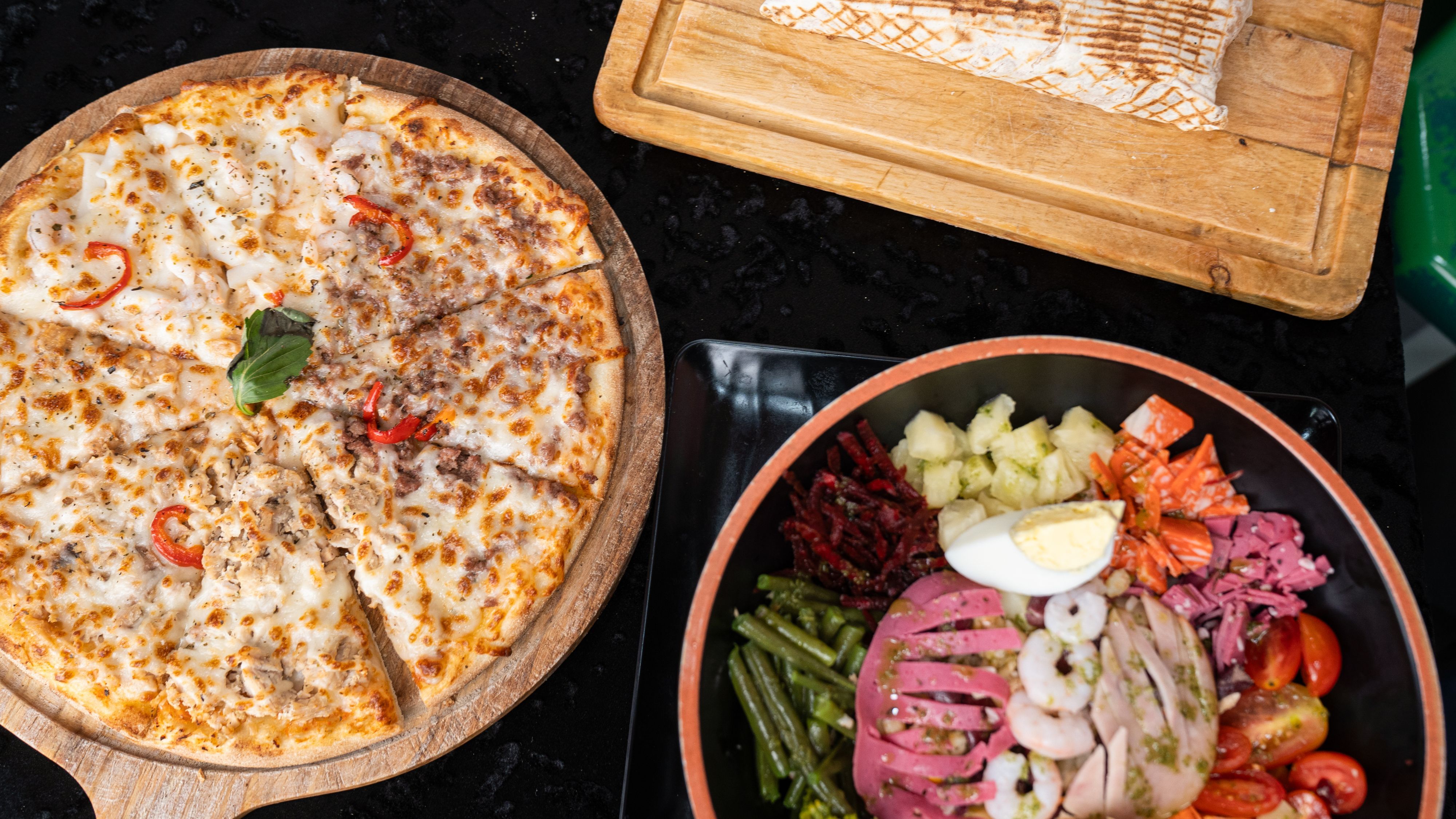 Sauce tomate, mozzarella, fruits de mer, viande hachée, poulet, légumes