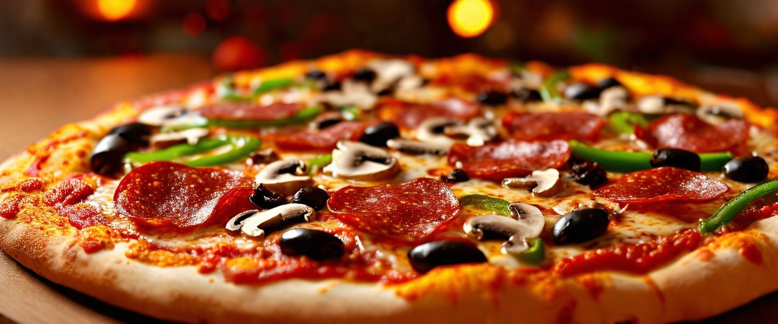 Sauce tomate, fromage mozzarella, viande hachée, poulet, jambon de dinde, champignons, poivrons, olives