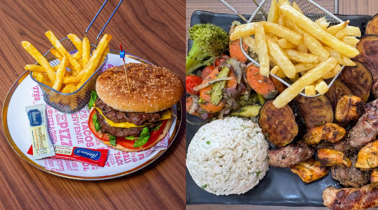 Viande hachée, poulet, saucisse, frites, sauce au choix, cuit au charbon