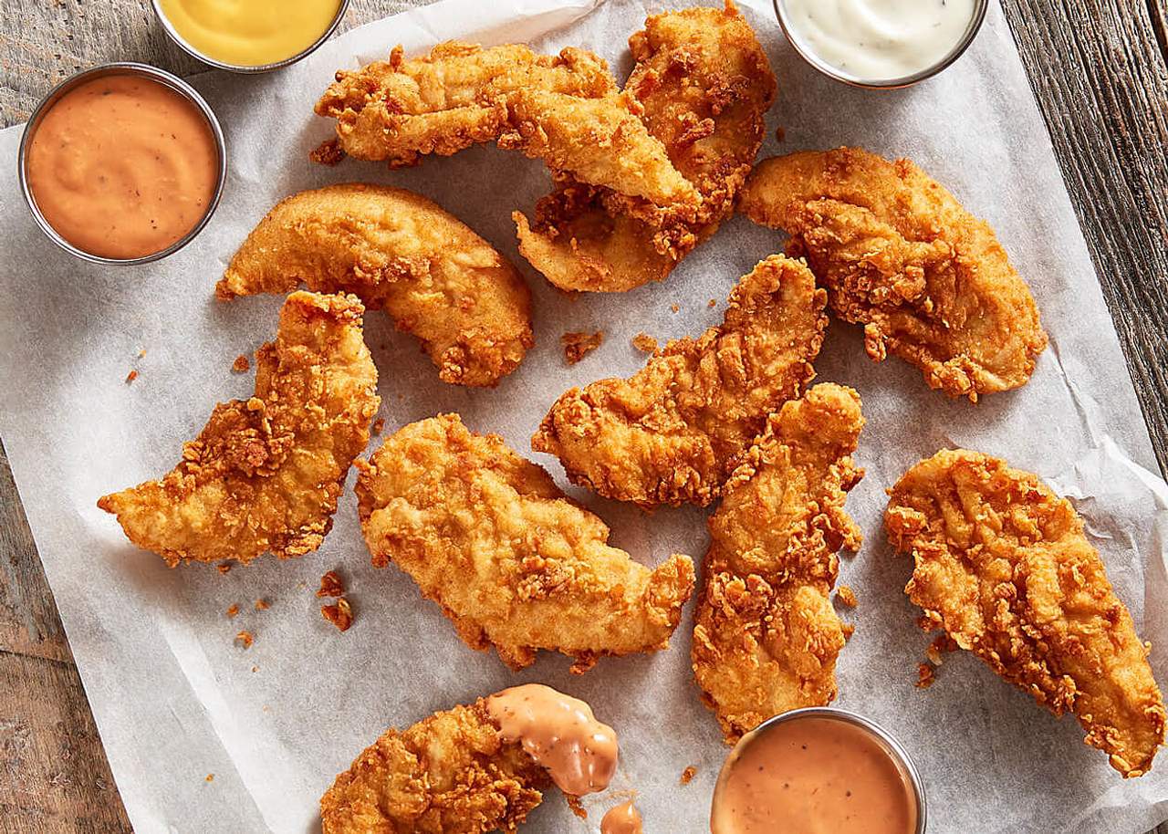 Tenders, sauce fromagère, frites, sauce au choix Servi avec frites