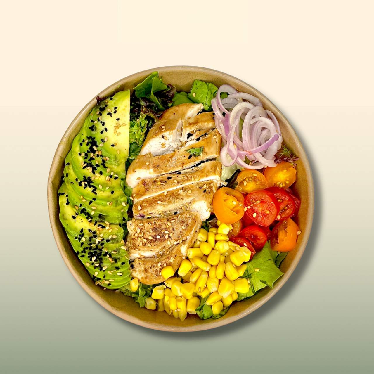 Chicken, avocado, corn, cherry tomato, lettuce, onion, chia, Caesar sauce, 620 kcal