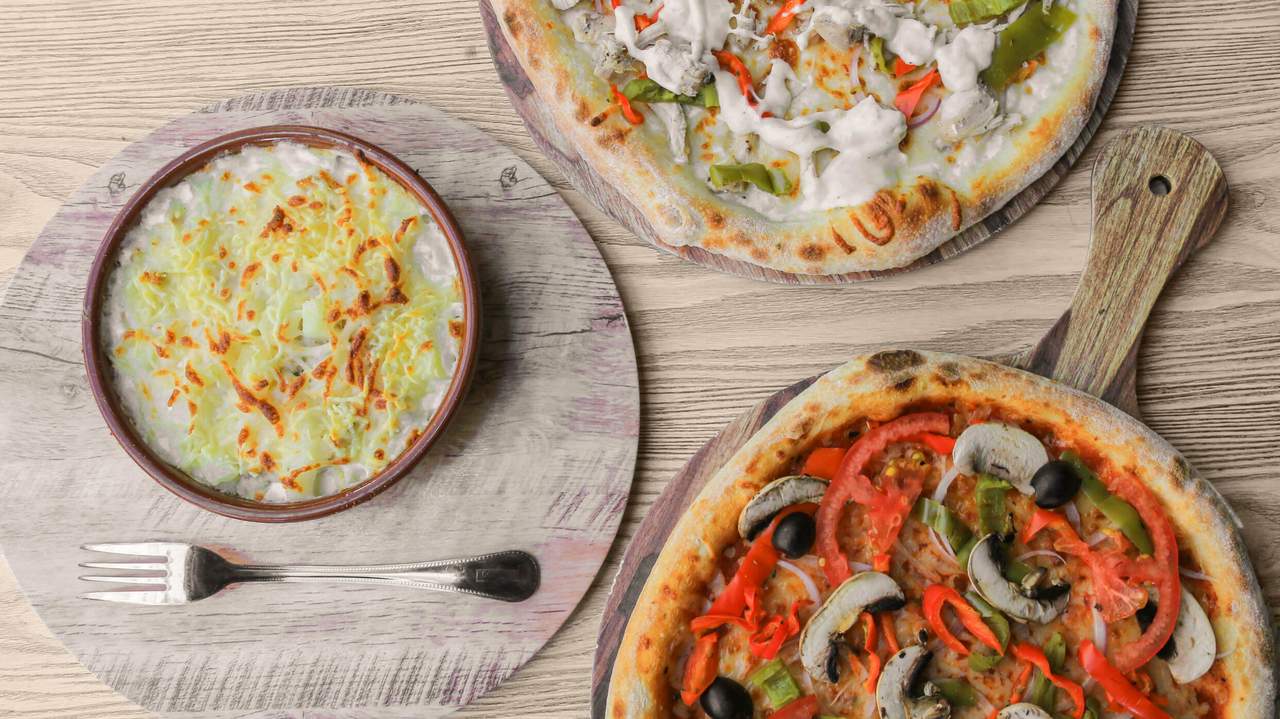 Crème fraîche, mozzarella, poulet mariné, champignons, oignons, olives, origan.