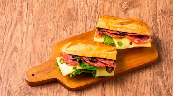 Poulet pané, dinde fumé, salade, oignon, tomate, tranche de cheddar, sauce au choix